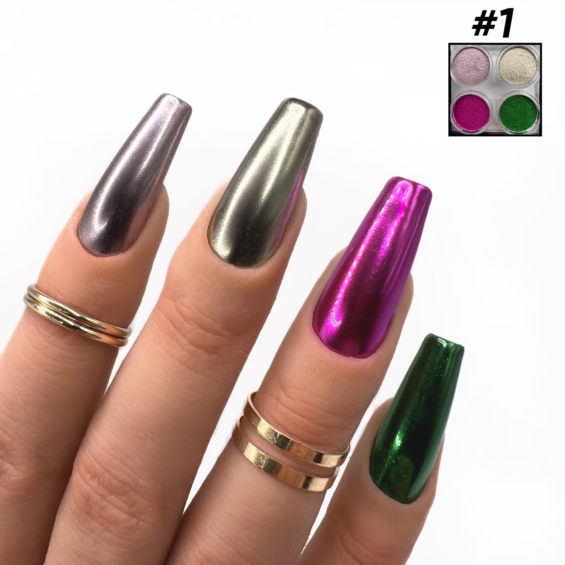 This is a great tool to have in your nail art kit. It's super easy to apply and creates dramatic results. It can be used on acrylic or natural nails. Chrome powders can be applied on different base colors, but black and white base are most commonly used. There's two sets to choose from